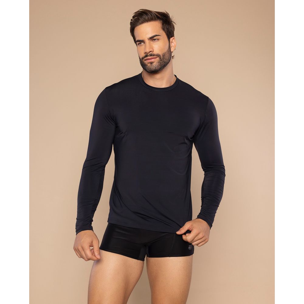 Blusa de proteção masculina, sendo proteção solar vitalicia (não perde a proteção solar conforme as lavagens), manga longa e gola redonda.