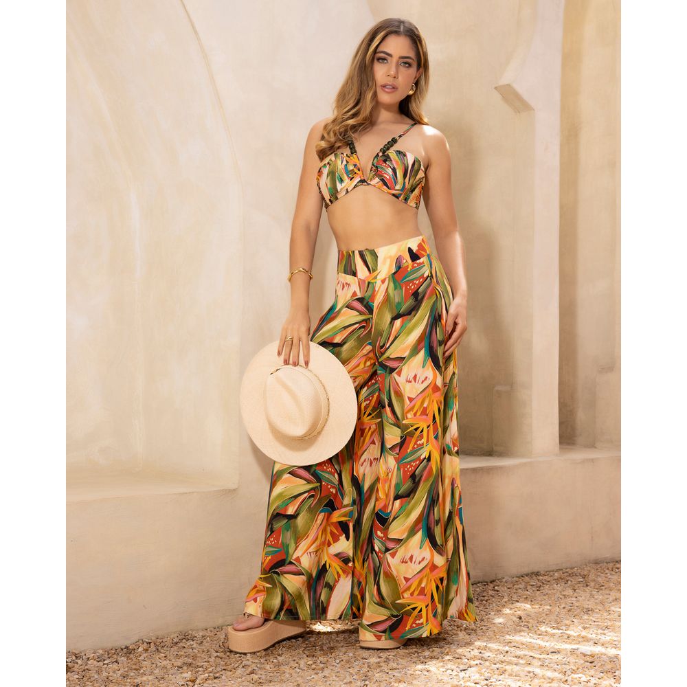 Calça pantalona estampada sendo cós alto reto e com elastico atrás.