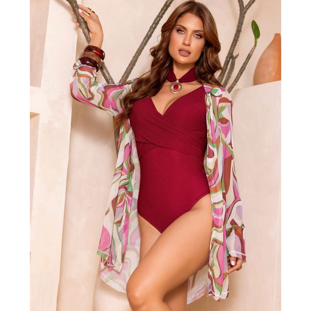 Camisa manga longa com abotoamento frontal e gola social, tecido com textura e comprimento medio. Possui transparencia e a barra das costas com comprimento maior.