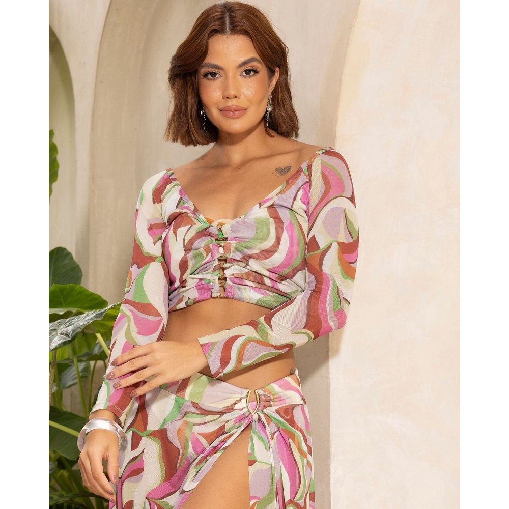 Cropped com manga longa, com transparencia, detalhe com argolas entre os seios, decote medio e comprimento curto.