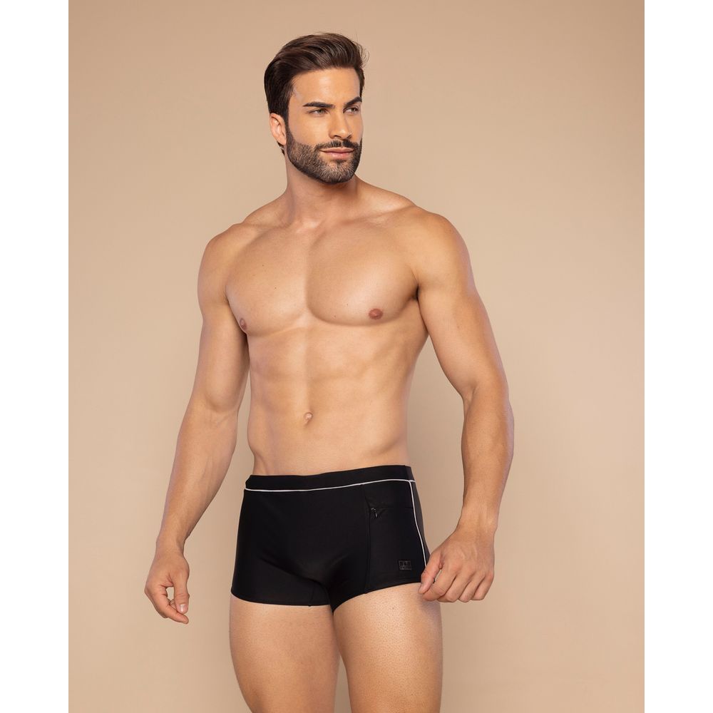 Sunga box com detalhe de uma listra no cós e uma listra na lateral. Possui um pequeno bolso na lateral e cordão interno para ajuste.