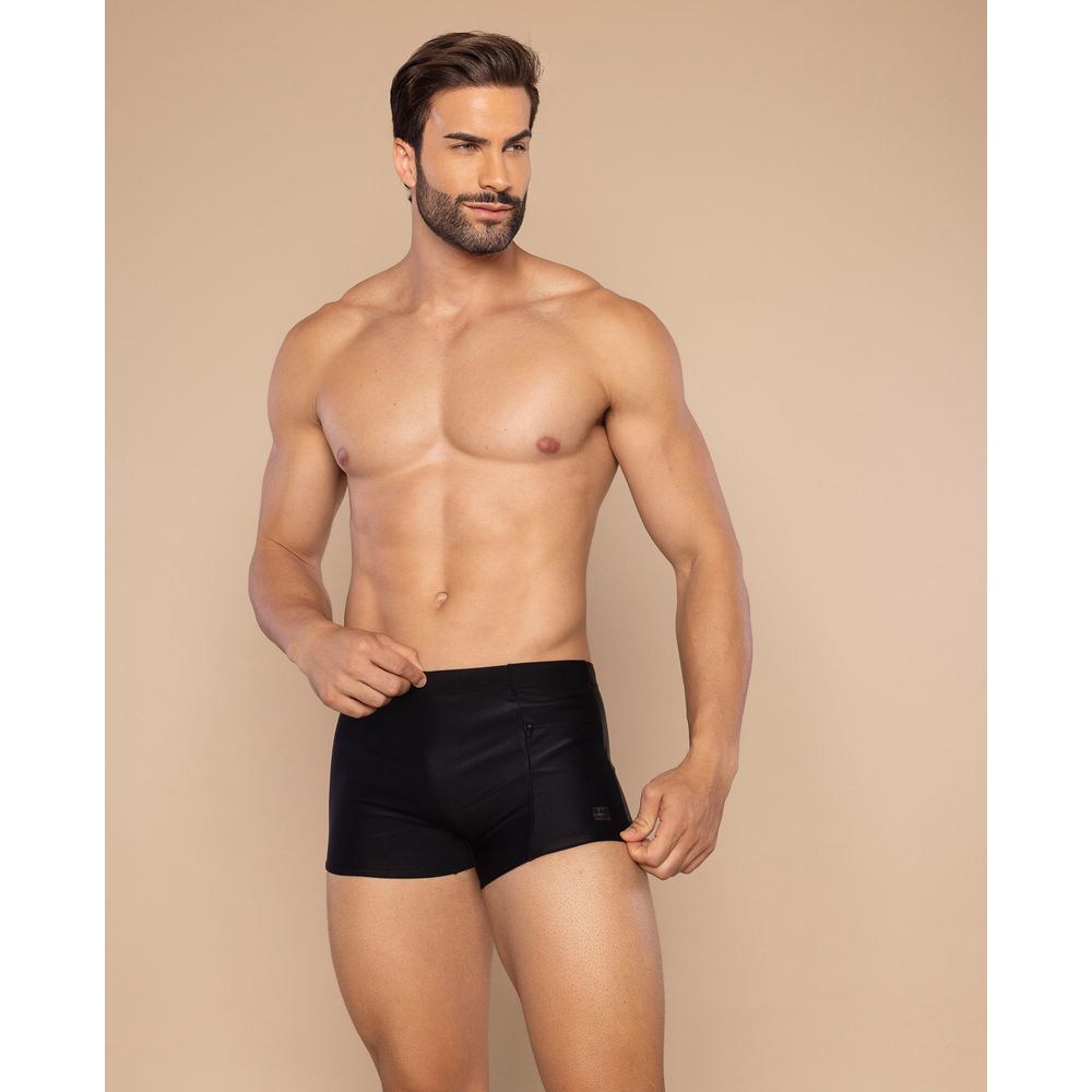 Sunga box lisa tradicional com pequeno bolso na lateral e cordão interno de ajuste.