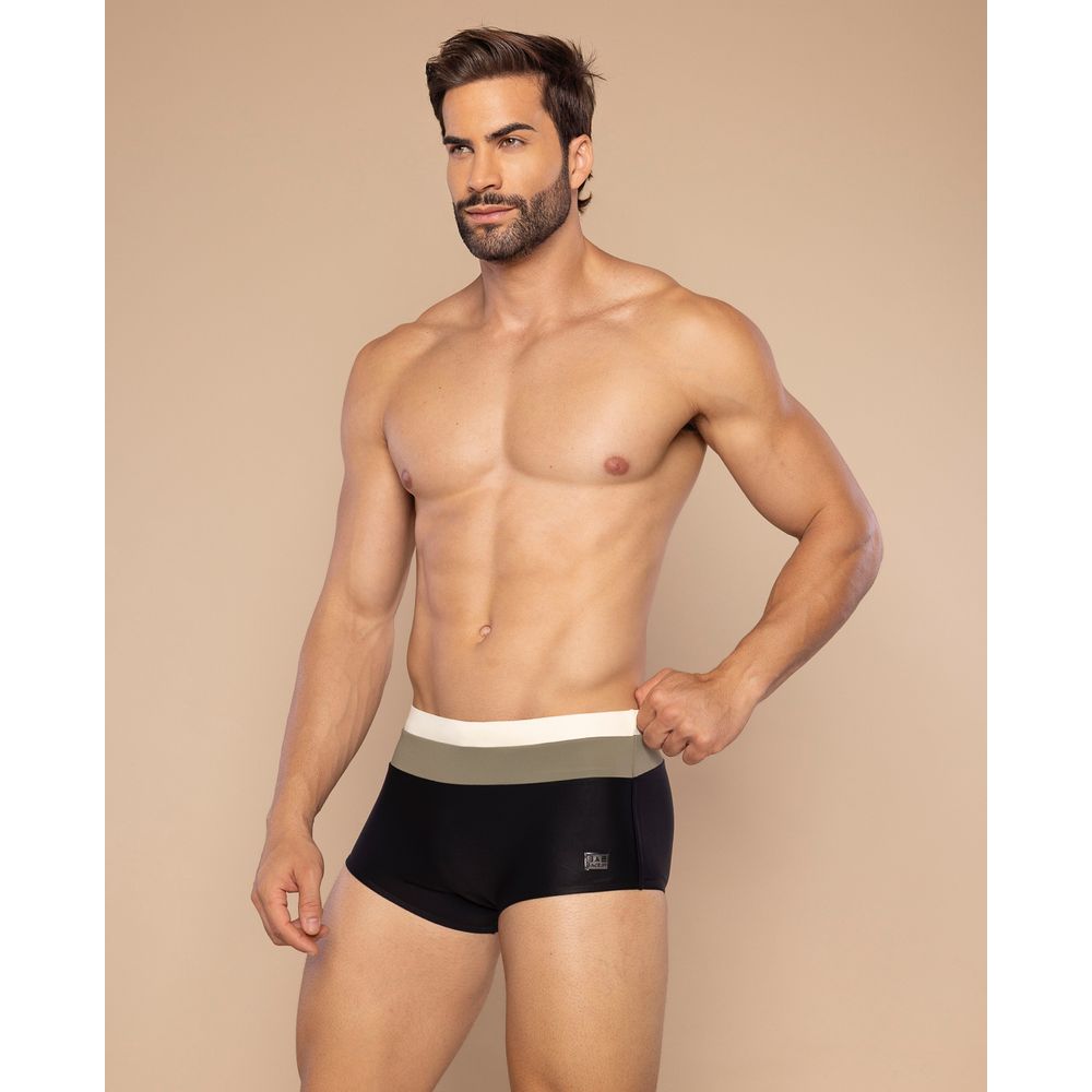 Sunga modelagem slip com cordão de ajuste interno no cós. Detalhe de recortes horizontais em outras cores no cós.