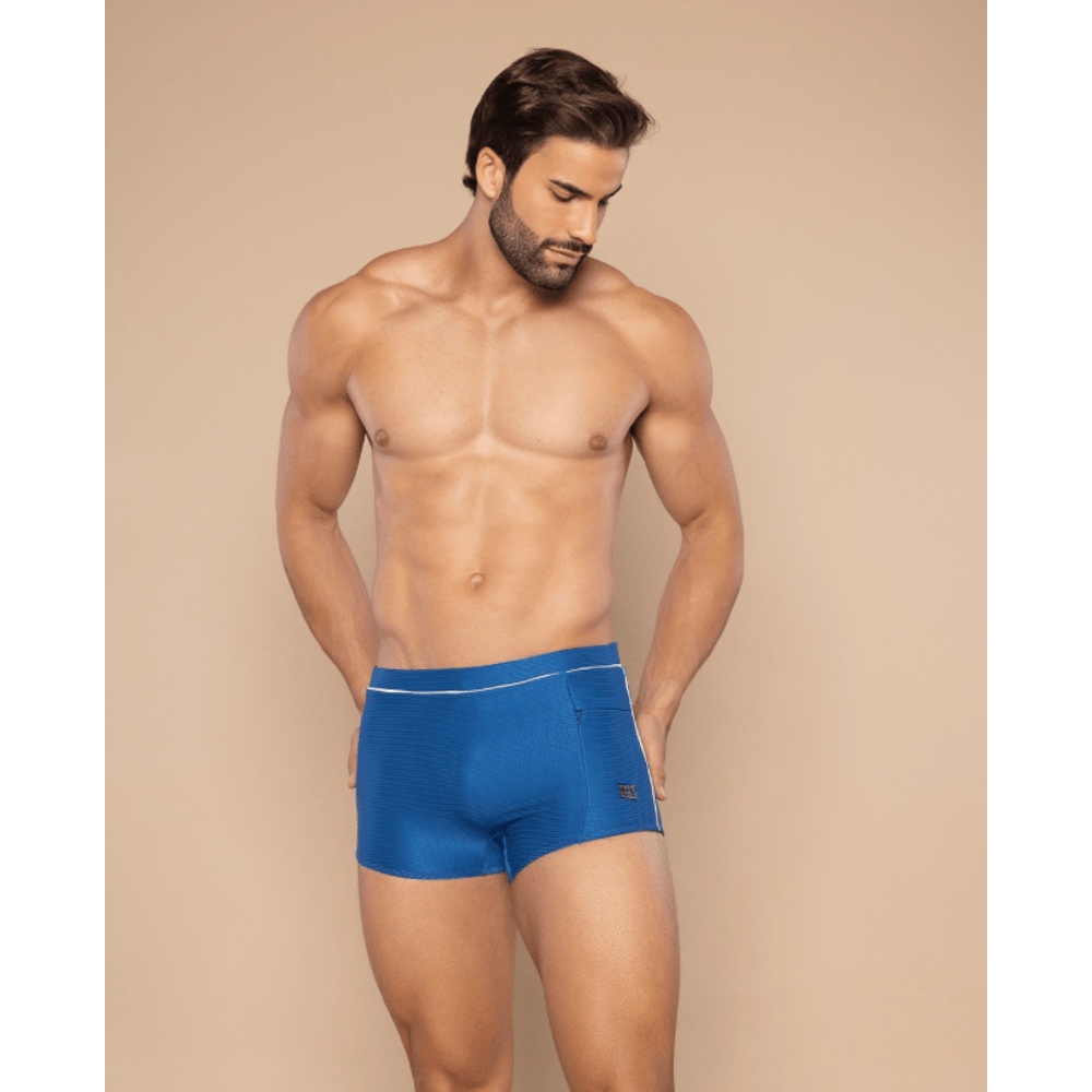 Sunga box, modelagem shortinho, com bolso pequeno na lateral com ziper invesivel, tecido texturizado, detalhe no cós e na lateral na cor branca. Possui cordão de amarração para ajuste interno.